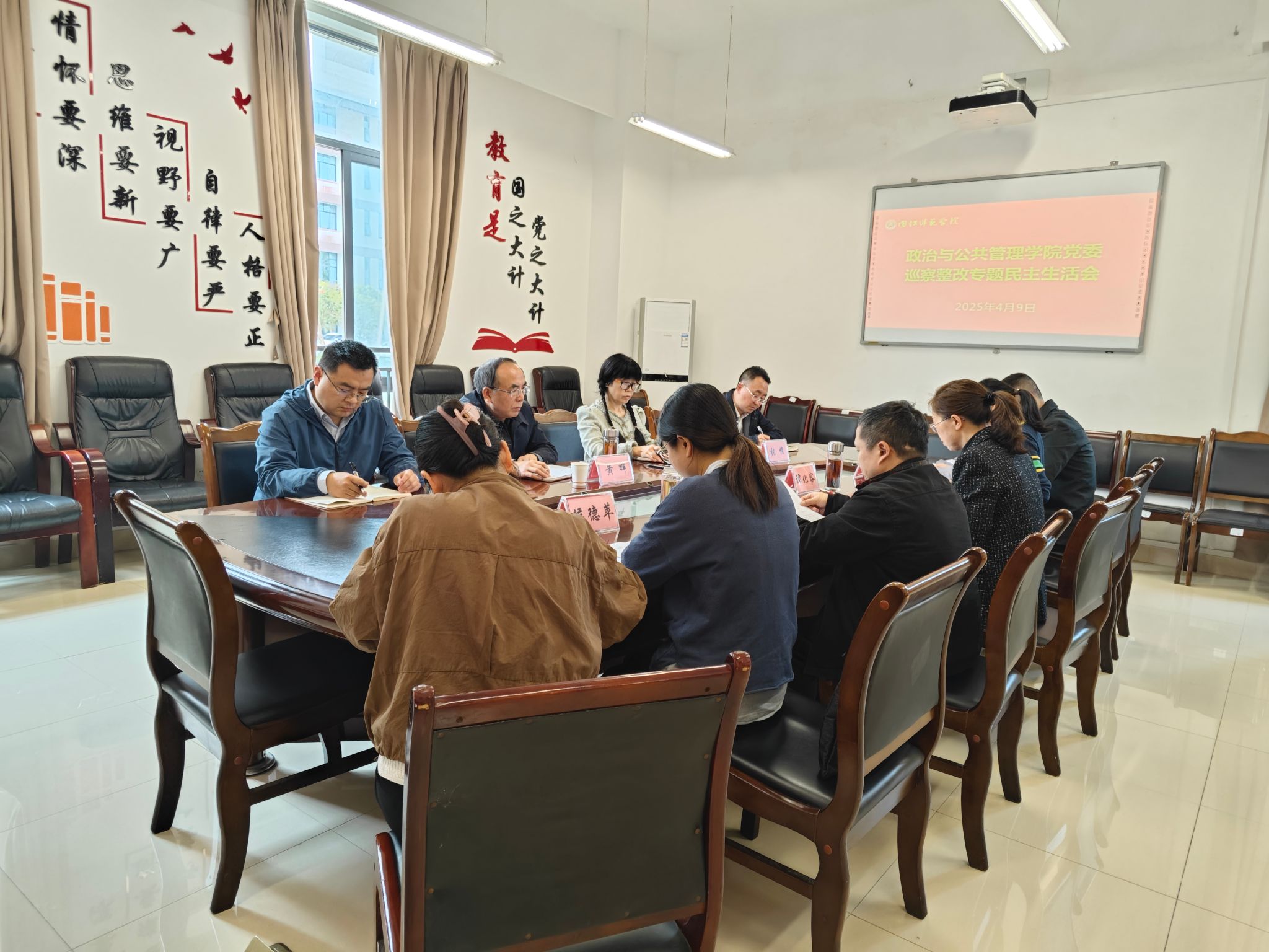 根据中共内江师范学院第四届委员会第一轮巡察第二巡察组巡察政治与公共管理学院党委整改工作要求,学院党委于2025年4月9日在学院会议室召开巡察整改专题民主生活会。学校党委常委、副书记黄辉,组织部专职组织员赵明骅,第二巡察组副组长许小涛,纪委监督检查科科长张憧莅临会议指导,学院领导班子参加会议。会议由学院党委书记谭化容主持。